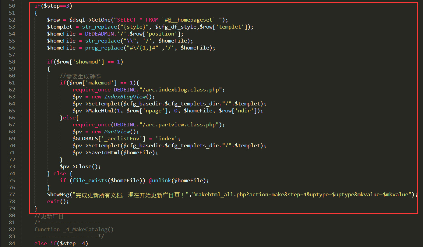 ShowMsg("完成更新所有文檔,現在開始更新欄目頁!","makehtml_all.php?action=make&step=4&uptype=$uptype&mkvalue=$mkvalue");