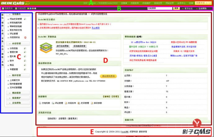 C區域【主體左側】對應文件:/dede/templets/index_menu2.htm【左側主鏈接】和/dede/inc/inc_menu.php【常用主鏈接下的次鏈接】、/dede/inc/inc_menu_map.php【主鏈接下的次鏈接】、/dede/inc/inc_menu_module.php【模塊和插件次導航】