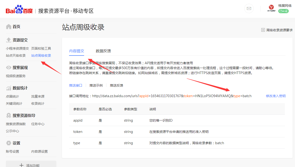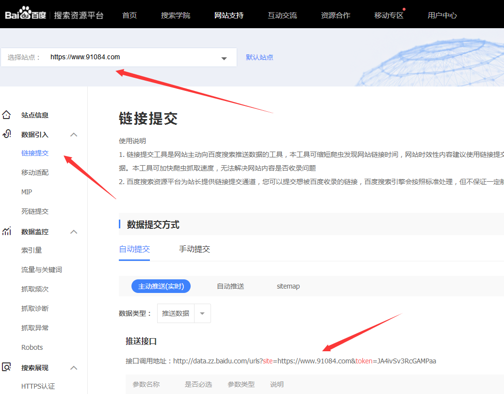 登錄你的百度平臺 https://ziyuan.baidu.com/ydzq/ 獲取接口調用地址