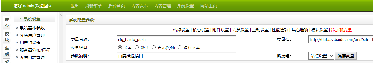 1、織夢網站后臺-系統-基本參數,添加新變量,如果變量值未填寫或者為空將不推送