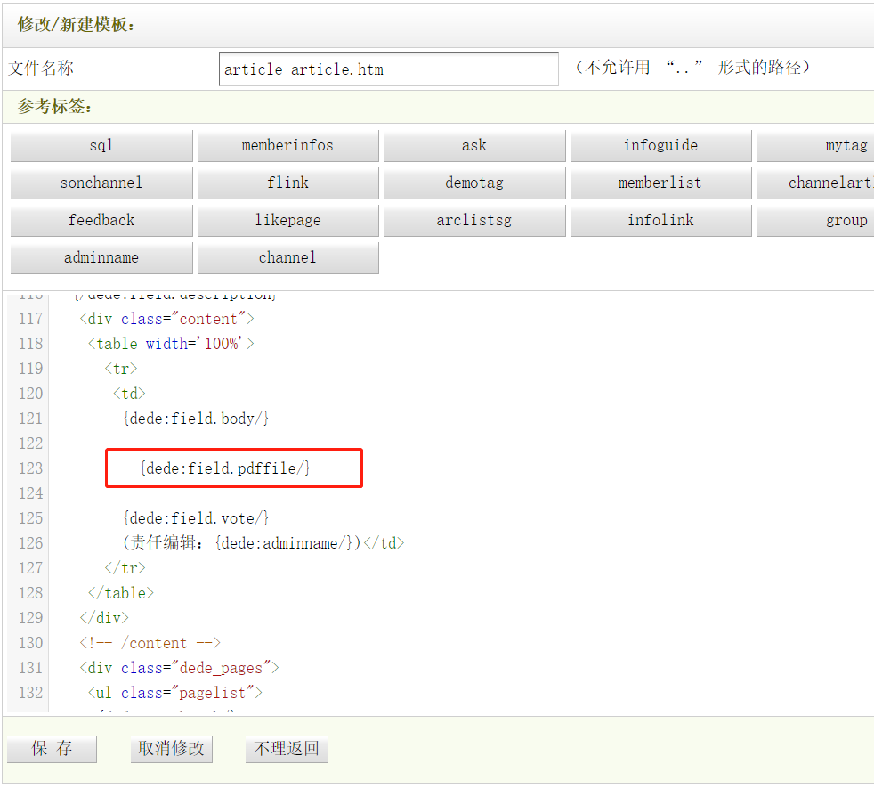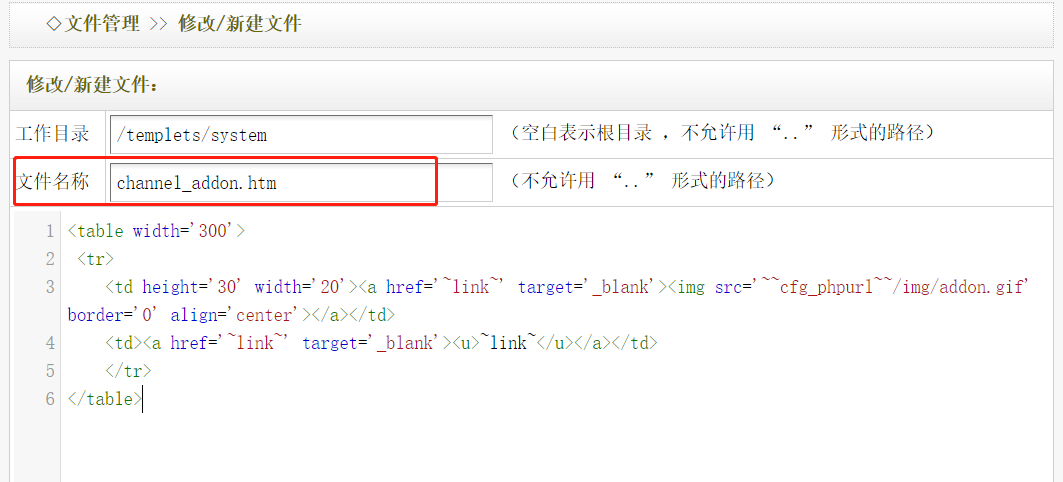 重點(diǎn)來了,我們需要修改 /templets/system/channel_addon.htm 文件。刪掉所有的代碼,只保留一個 ~link~ 即可。