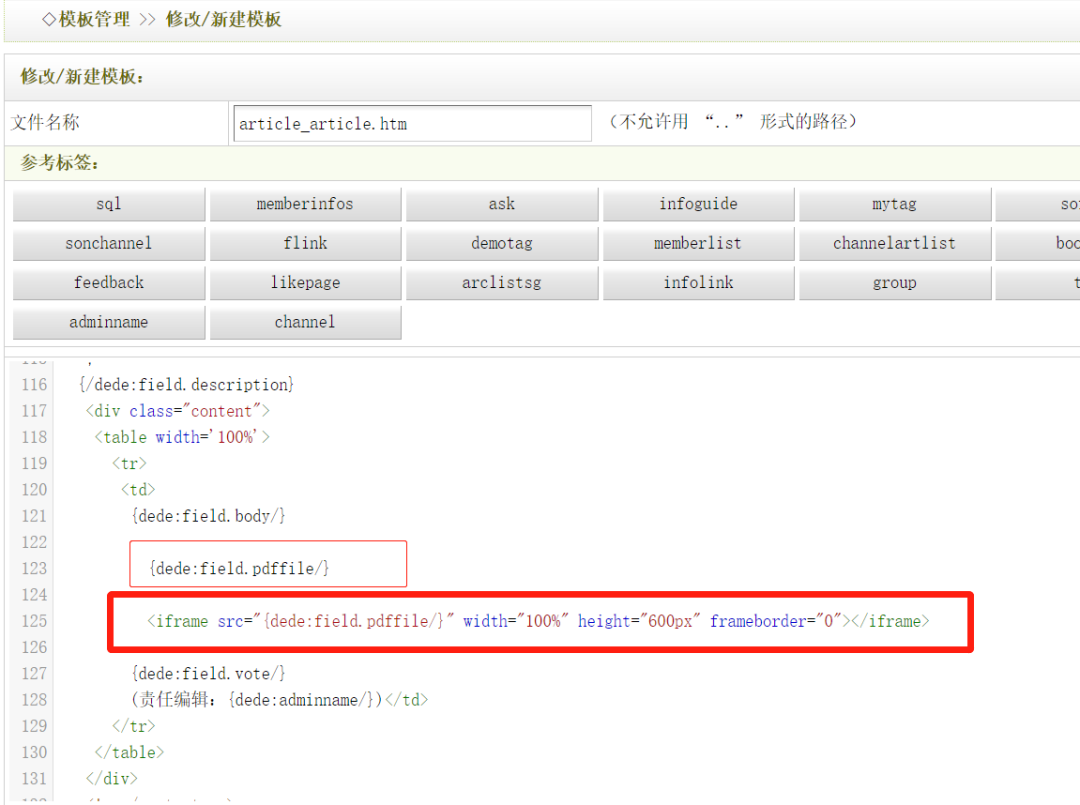 <iframe src="{dede:field.pdffile/}" width="100%" height="600px" frameborder="0"></iframe>