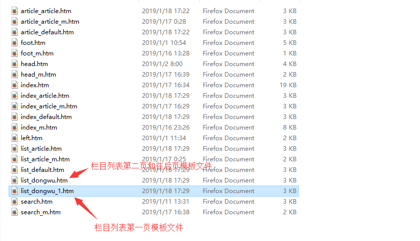 系統在動態或者生成靜態時,欄目列表第一頁優先去找這個 _1 的第一頁模板文件,存在就輸出,不存在就使用默認的原列表模板 list_dongwu.htm