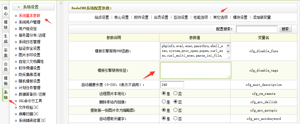 2、后臺 - 系統 - 系統設置 - 系統基本參數 - 其他選項 - 禁用模板標簽 ,把php刪除后保存。