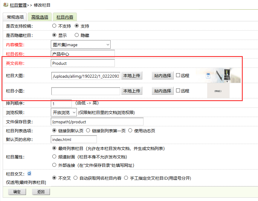 以上是覆蓋文件的方式完成對欄目添加[英文名稱] [欄目大圖] [欄目小圖] 功能