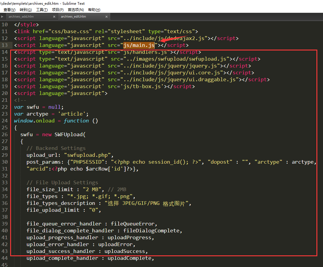 <script type="text/javascript"src="js/handlers.js"></script><script type="text/javascript" src="../images/swfupload/swfupload.js"></script><script language="javascript" src="../include/js/jquery/jquery.js"></script><script language="javascript" src="../include/js/jquery/ui.core.js"></script><script language="javascript" src="../include/js/jquery/ui.draggable.js"></script><script lang='javascript' src='js/tb-box.js'></script><script language="javascript"><!--var swfu = null;var arctype = 'article';window.onload = function (){swfu = new SWFUpload({// Backend Settingsupload_url: "swfupload.php",post_params: {"PHPSESSID": "<?php echo session_id(); ?>", "dopost" : "", "arctype" : arctype},// File Upload Settingsfile_size_limit : "2 MB", // 2MBfile_types : "*.jpg; *.gif; *.png",file_types_description : "選擇 JPEG/GIF/PNG 格式圖片",file_upload_limit : "0",file_queue_error_handler : fileQueueError,file_dialog_complete_handler : fileDialogComplete,upload_progress_handler : uploadProgress,upload_error_handler : uploadError,upload_success_handler : uploadSuccess,upload_complete_handler : uploadComplete,button_image_url : "../images/SmallSpyGlassWithTransperancy_17x18.png",button_placeholder_id : "spanButtonPlaceholder",button_width: '100%',button_height: 26,button_text : '<div class="button" style="background-color:#E5F1CF; height:26px; text-align:center; line-height:26px">上傳圖片(可多選)</div>',button_text_style : '',button_text_top_padding: 0,button_text_left_padding: 10,button_window_mode: SWFUpload.WINDOW_MODE.TRANSPARENT,button_cursor: SWFUpload.CURSOR.HAND,// Flash Settingsflash_url : "../images/swfupload/swfupload.swf",custom_settings : {upload_target : "divFileProgressContainer"},// Debug Settingsdebug: false});};function addtoEdit(pid){jQuery.get('swfupload.php?dopost=addtoedit&id=' + pid, function(data){var picTitle = jQuery('input[name="picinfook'+pid+'"]').val();var picHTML = '<img src="'+data+'" alt="'+picTitle+'"/>';CKEDITOR.instances.body.insertHtml(picHTML);});}//刪除已經上傳的圖片function delAlbPic(pid){// 同步刪除編輯器中插入的圖片jQuery("#__tmpbody").html();jQuery.get('swfupload.php?dopost=addtoedit&id=' + pid, function(data){var iptbody = CKEDITOR.instances.body.getData();jQuery("#__tmpbody").html(iptbody);jQuery("#__tmpbody").find('img').each(function(){if(jQuery(this).attr('src') == data){//alert(data);jQuery(this).remove();}});CKEDITOR.instances.body.setData(jQuery("#__tmpbody").html());jQuery("#__tmpbody").html();var tgobj = $Obj('albCtok'+pid);var myajax = new DedeAjax(tgobj);myajax.SendGet2('swfupload.php?dopost=del&id='+pid);$Obj('thumbnails').removeChild(tgobj);});}//刪除已經上傳的圖片(編輯時用)function delAlbPicOld(picfile, pid){var tgobj = $Obj('albold'+pid);var myajax = new DedeAjax(tgobj);myajax.SendGet2('swfupload.php?dopost=delold&picfile='+picfile);$Obj('thumbnailsEdit').removeChild(tgobj);}--></script>