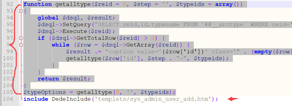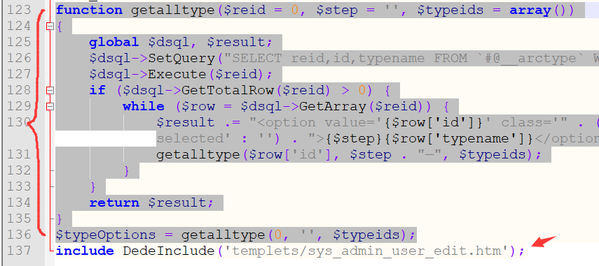 function getalltype($reid = 0, $step = '', $typeids = array()){global $dsql, $result;$dsql->SetQuery("SELECT reid,id,typename FROM `dede_arctype` WHERE reid='$reid' AND (ispart=0 OR ispart=1) ORDER BY sortrank");$dsql->Execute($reid);if ($dsql->GetTotalRow($reid) > 0) {while ($row = $dsql->GetArray($reid)) {$result .= "<option value='{$row['id']}' class='" . (empty($row['reid']) ? 'b' : 's') . "type'" . (in_array($row['id'], $typeids) ? ' selected' : '') . ">{$step}{$row['typename']}</option>\r\n";getalltype($row['id'], $step . "—", $typeids);}}return $result;}$typeOptions = getalltype(0, '', $typeids);