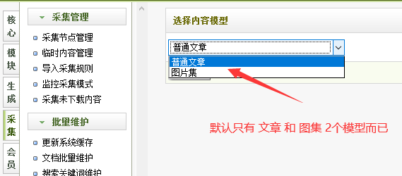 織夢后臺采集模塊添加新節點時,默認只有 【普通文章】和【圖片集】2個模型可選而已