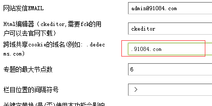 后臺(tái)-系統(tǒng)-系統(tǒng)配置參數(shù)-核心設(shè)置-跨域共享cookie的域名(例如:.91084.com)
