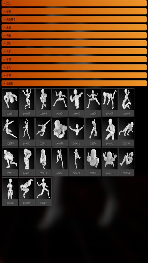 豐富的動作,動畫庫,通過Pofi云數(shù)據(jù)庫,不定期更新,訪問常見的姿勢。貼近各類主題,使用簡單,不需要熟悉人體結(jié)構(gòu),就能得到合理的人偶動作姿勢。