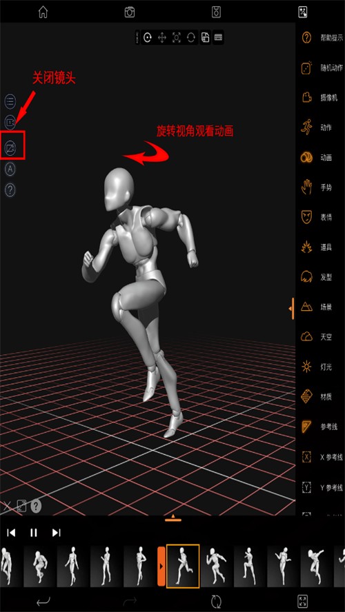 5.每個動畫都自帶鏡頭并鎖定視圖,如果想調(diào)整動畫角度,可以關(guān)閉鏡頭,旋轉(zhuǎn)視角觀看動畫了。