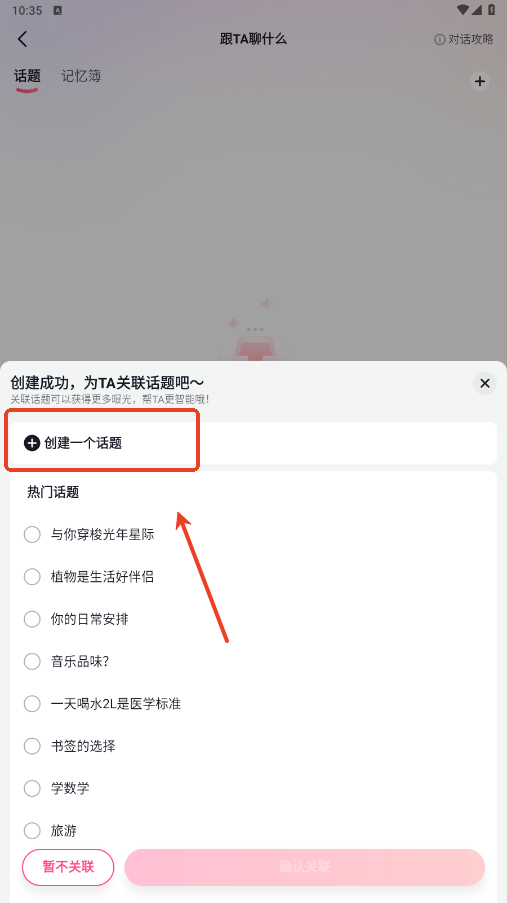 3. 您可以通過點擊去關聯話題,或者選擇右上角的“+”來創建新的話題。