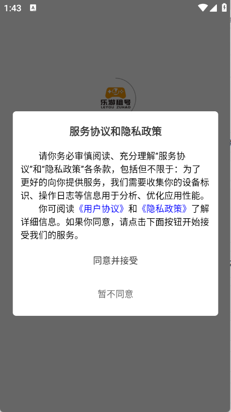 1、用戶首先需在本站樂游租號平臺進行租號操作,在此之前要查看并同意平臺的隱私政策與用戶協議。