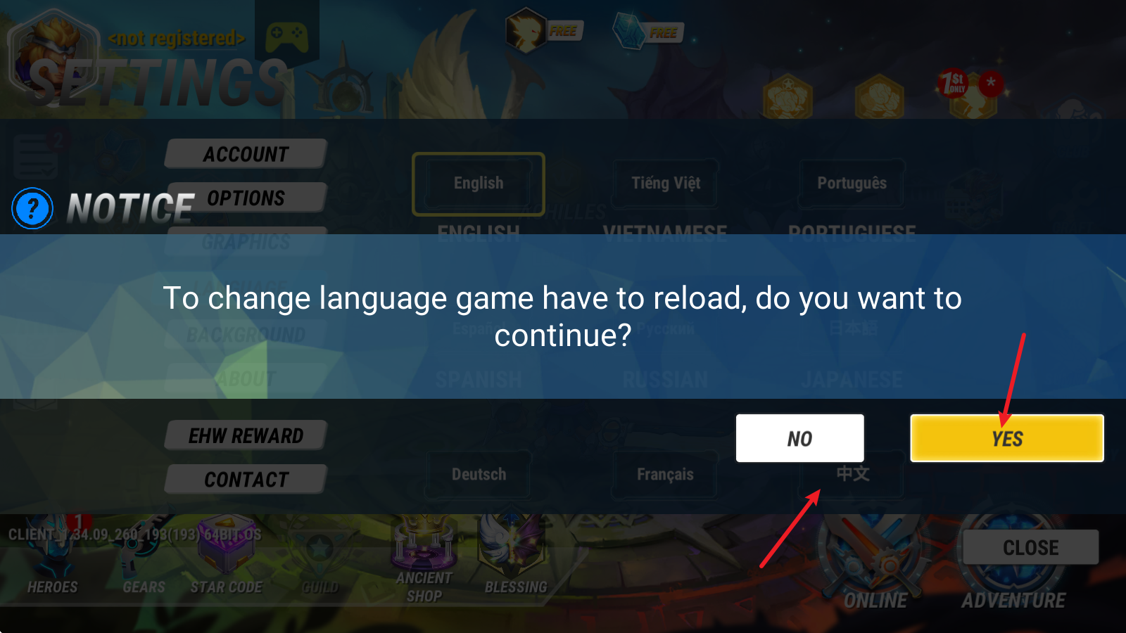 3、隨后點擊中文后,選擇yes確認,之后重啟游戲后即可切換。
