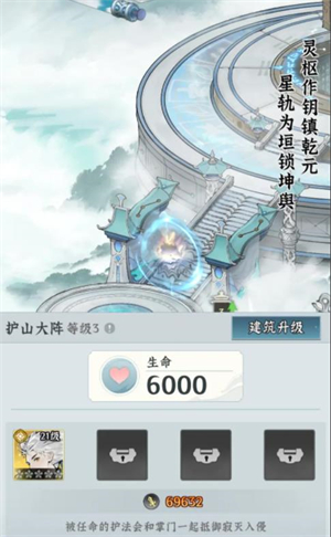 4、宗門防御方面有三個建筑,分別是護山大陣、護山劍陣和山門。山門是宗門與修仙界連通的唯一通道,也是抵御其他宗門偷襲的防線。開啟限時防護陣可避免被進攻,但防護陣靈力耗盡后,宗門會隨機遷移。升級山門能提高防護陣的靈力上限與恢復速度,推薦后期升級。護山劍陣能召喚神劍,自動抵御寂滅入侵。宗門最多可修建“天、地、玄、黃”四座劍陣,若所有劍陣被毀,護山大陣便會失效。寂滅入侵時,護山大陣是守護宗內建筑與門人的重要屏障。升級大陣可提升防護陣法的生命上限,還能增加護法任命欄位。